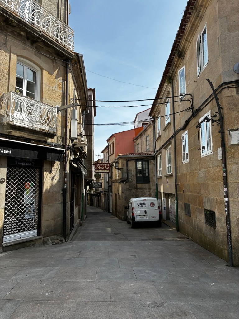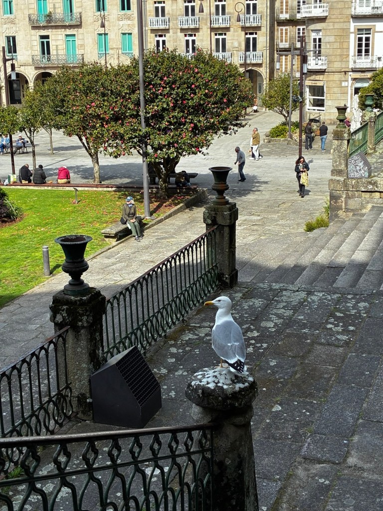 Resting, recuperating in Pontevedra. Last night’s dinner was yummy, although I did have to complain about the first glass of wine they brought me. It was a Rioja and it sucked. The second bottle (I drank it by the glass) was also a Rioja, and much better – light years better – and a delight.